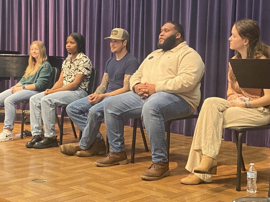 Q&A Writers Panel: BPC students Anna Farris (sophomore), R’eyahn Shaffer (senior), and John Carroll; alumni Willie Ford and Johnna Goodman